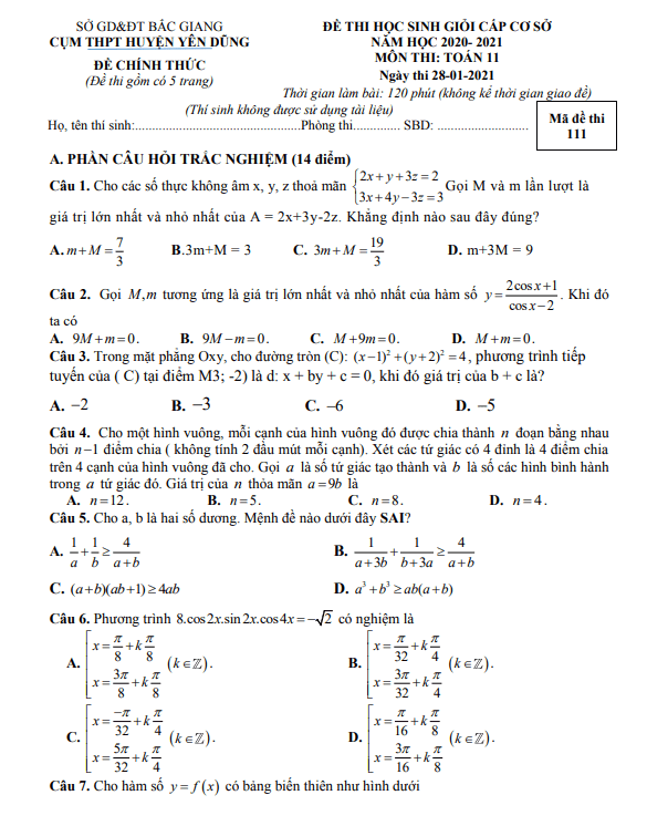 Đề HSG Toán 11 năm 2020 – 2021 cụm THPT huyện Yên Dũng – Bắc Giang