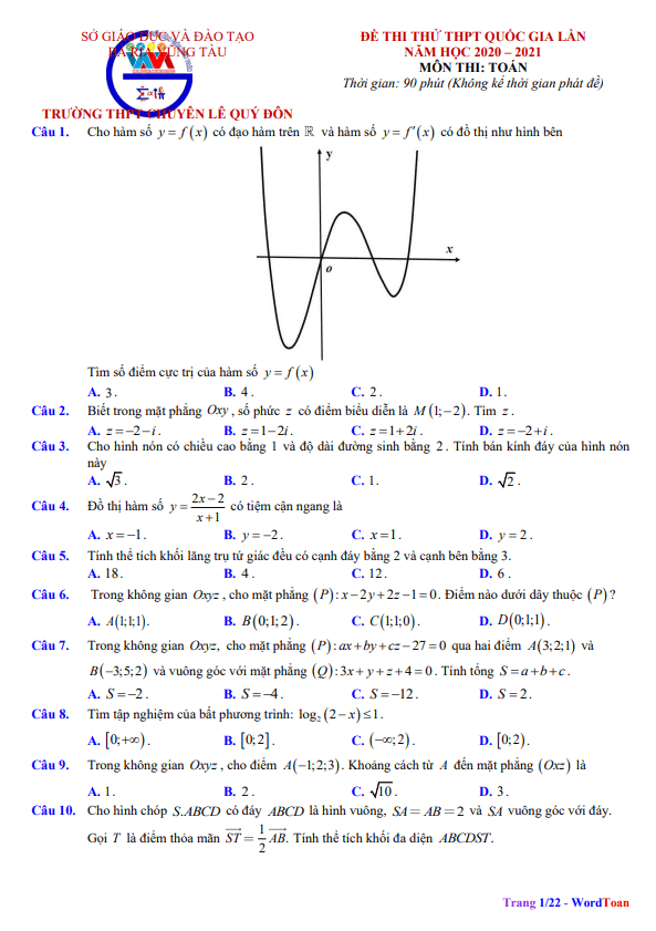 Đề thi thử Toán THPT 2021 trường chuyên Lê Quý Đôn – Bà Rịa – Vũng Tàu