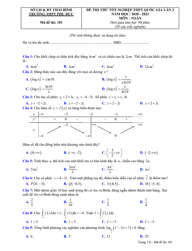 Đề thi thử tốt nghiệp THPT 2021 môn Toán lần 2 trường THPT Phụ Dực – Thái Bình