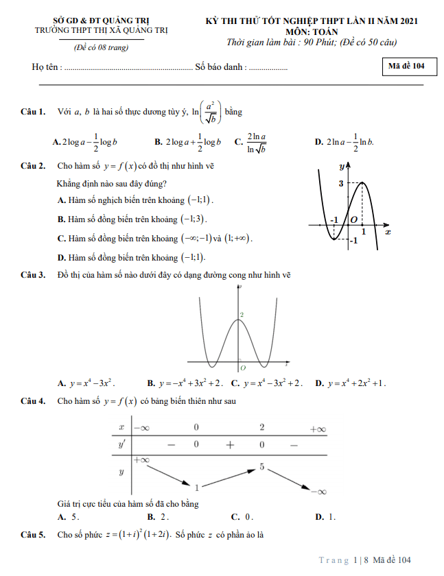 Đề thi thử tốt nghiệp THPT 2021 môn Toán lần 2 trường THPT Thị xã Quảng Trị