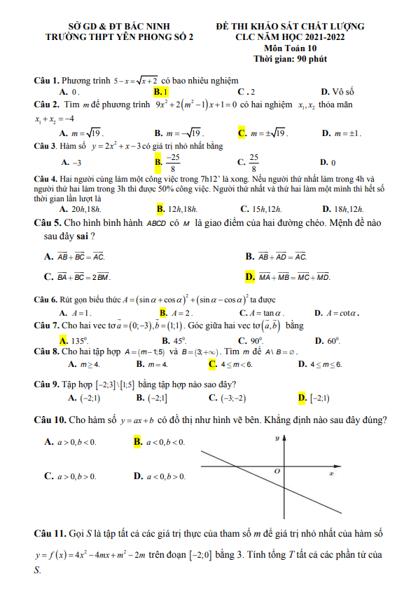 Khảo Sát Chất Lượng Toán 10 Đề khảo sát Toán 10 năm 2021 – 2022 trường THPT Yên Phong 2 – Bắc Ninh 25/01/2022