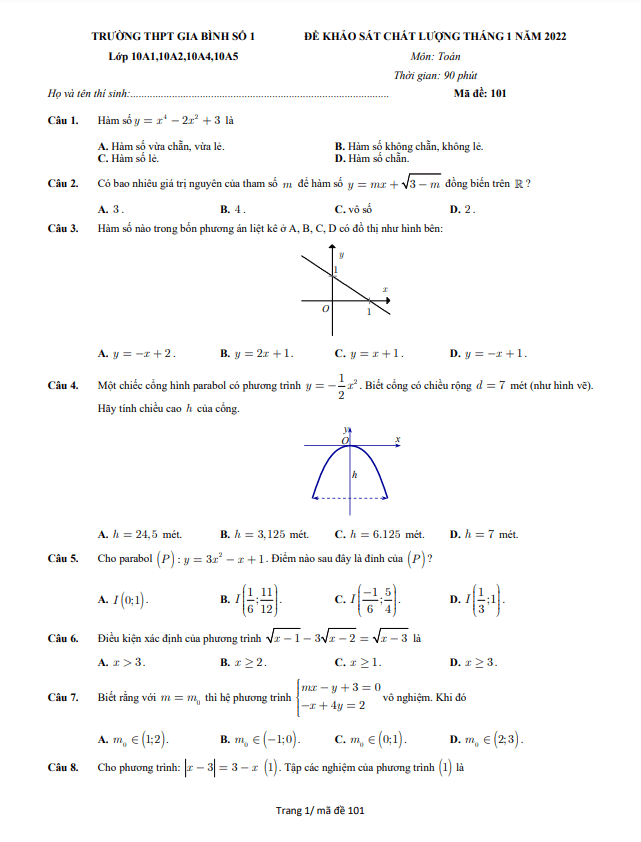 Khảo Sát Chất Lượng Toán 10 Đề khảo sát Toán 10 tháng 1 năm 2022 trường THPT Gia Bình 1 – Bắc Ninh 25/01/2022