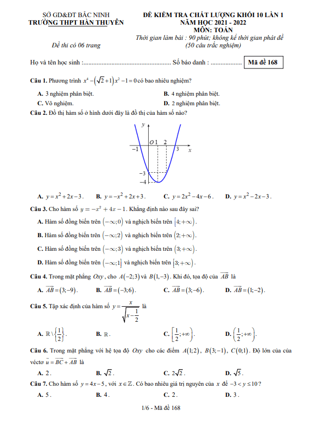 Khảo Sát Chất Lượng Toán 10 Đề kiểm tra chất lượng Toán 10 lần 1 năm 2021 – 2022 trường Hàn Thuyên – Bắc Ninh 20/01/2022