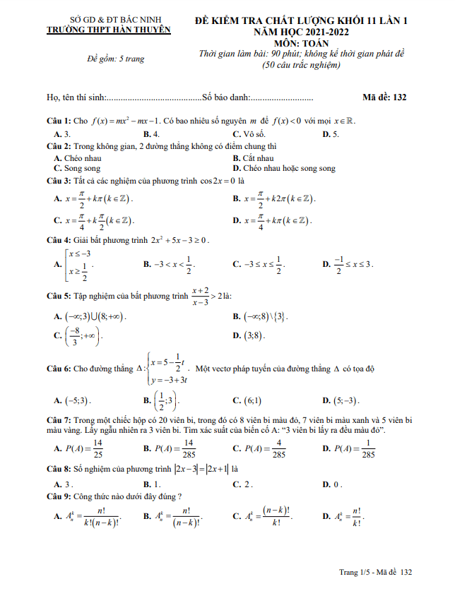 Khảo Sát Chất Lượng Toán 11 Đề kiểm tra chất lượng Toán 11 lần 1 năm 2021 – 2022 trường Hàn Thuyên – Bắc Ninh 20/01/2022