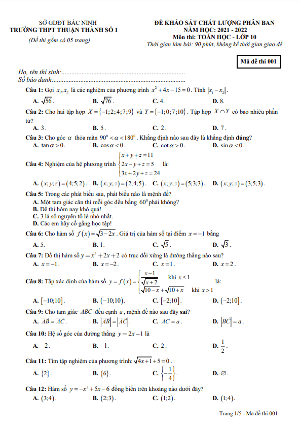 Khảo Sát Chất Lượng Toán 10 Đề KSCL phân ban Toán 10 năm 2021 – 2022 trường Thuận Thành 1 – Bắc Ninh 20/01/2022