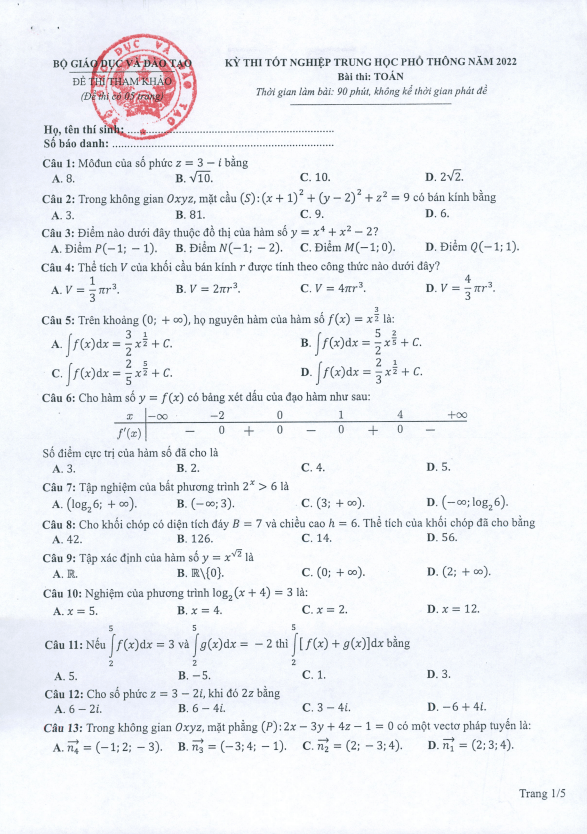 Đề Thi Thử THPT Môn Toán Đáp án và lời giải chi tiết đề minh họa tốt nghiệp THPT 2022 môn Toán 02/04/2022
