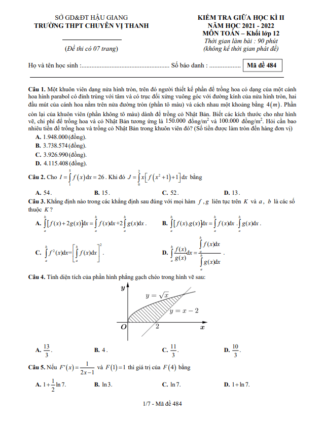 Đề Thi Giữa HK2 Toán 12 Đề giữa học kì 2 Toán 12 năm 2021 – 2022 trường chuyên Vị Thanh – Hậu Giang 04/04/2022