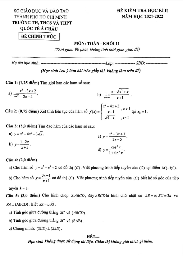 Đề Thi HK2 Toán 11 Đề thi học kỳ 2 Toán 11 năm 2021 – 2022 trường THPT Lý Thường Kiệt – TP HCM 23/06/2022