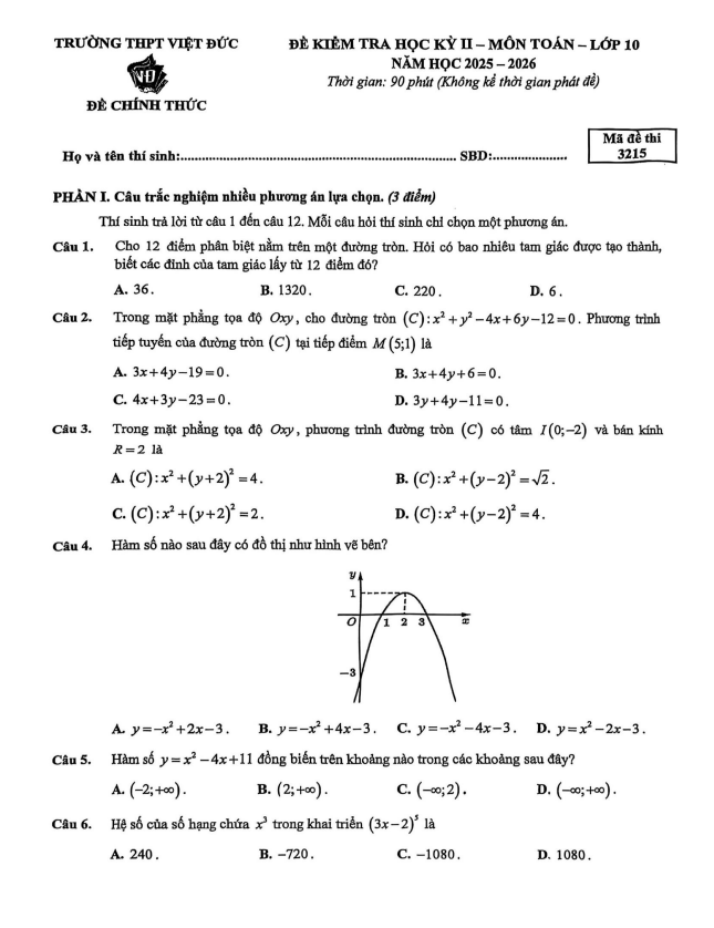 Đề khảo sát Toán 12 lần 3 năm 2025 – 2026 trường THPT Trần Phú – Hà Nội