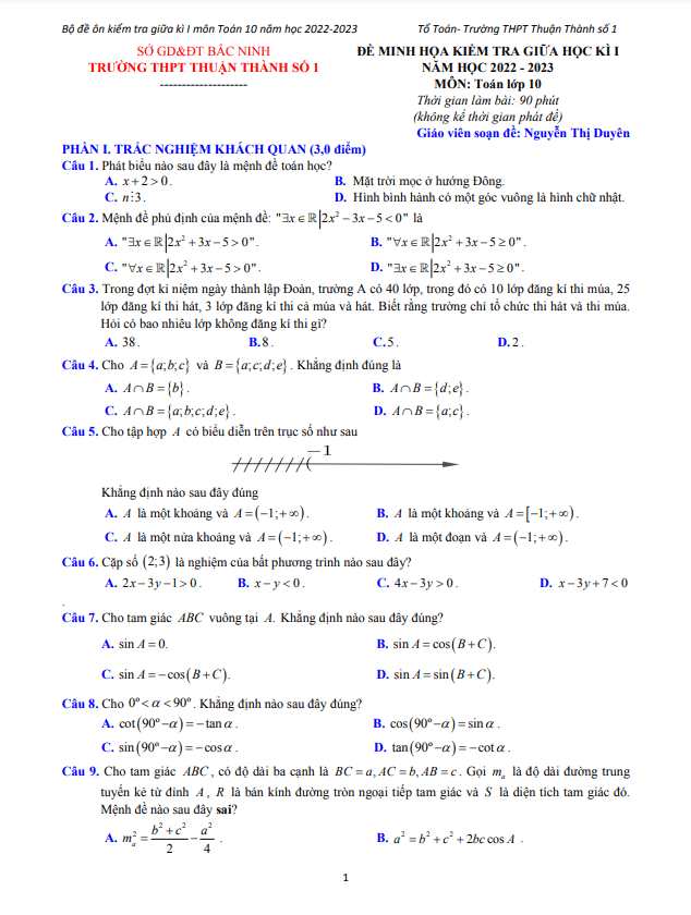 Đề Thi Giữa HK1 Toán 10 Bộ đề ôn tập giữa kì 1 Toán 10 năm 2022 – 2023 THPT Thuận Thành 1 – Bắc Ninh 29/10/2022