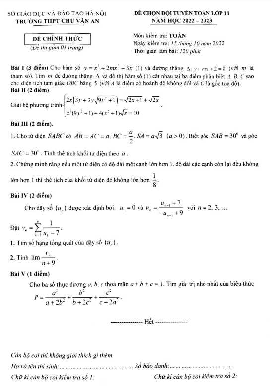 Đề Thi HSG Toán 11 Đề chọn đội tuyển Toán 11 năm 2022 – 2023 trường THPT Chu Văn An – Hà Nội 30/10/2022
