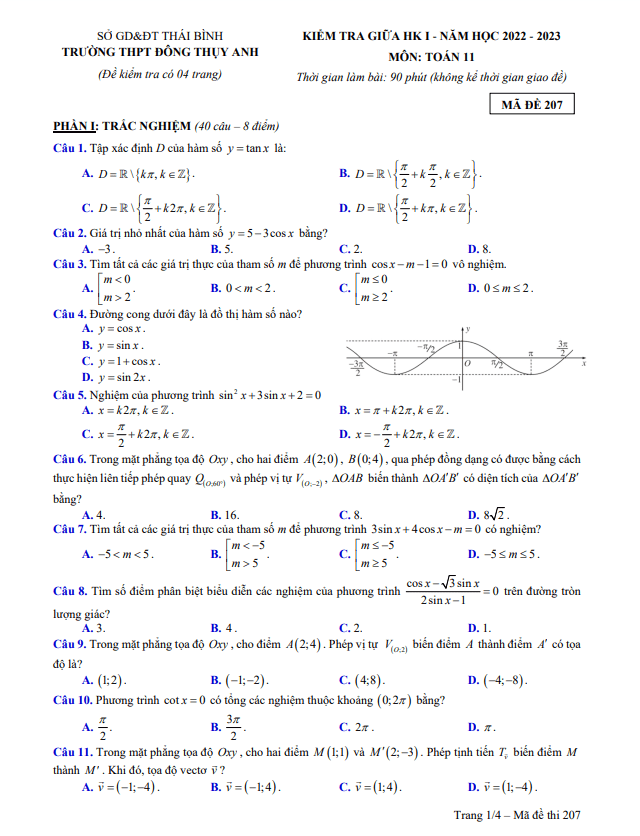 Đề Thi Giữa HK1 Toán 11 Đề giữa HK1 Toán 11 năm 2022 – 2023 trường THPT Đông Thụy Anh – Thái Bình 27/10/2022
