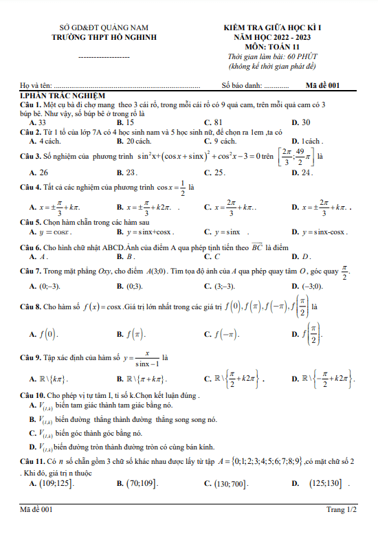 Đề Thi Giữa HK1 Toán 11 Đề giữa học kì 1 Toán 11 năm 2022 – 2023 trường THPT Hồ Nghinh – Quảng Nam 31/10/2022