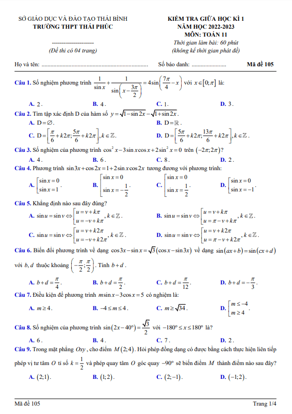Đề Thi Giữa HK1 Toán 11 Đề giữa học kì 1 Toán 11 năm 2022 – 2023 trường THPT Thái Phúc – Thái Bình 27/10/2022