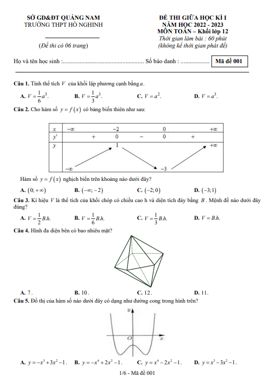 Đề Thi Giữa HK1 Toán 12 Đề giữa học kì 1 Toán 12 năm 2022 – 2023 trường THPT Hồ Nghinh – Quảng Nam 31/10/2022