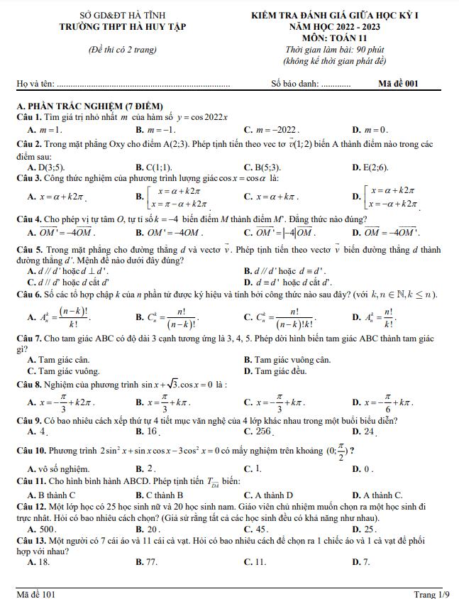 Đề Thi Giữa HK1 Toán 11 Đề giữa học kỳ 1 Toán 11 năm 2022 – 2023 trường THPT Hà Huy Tập – Hà Tĩnh 28/10/2022