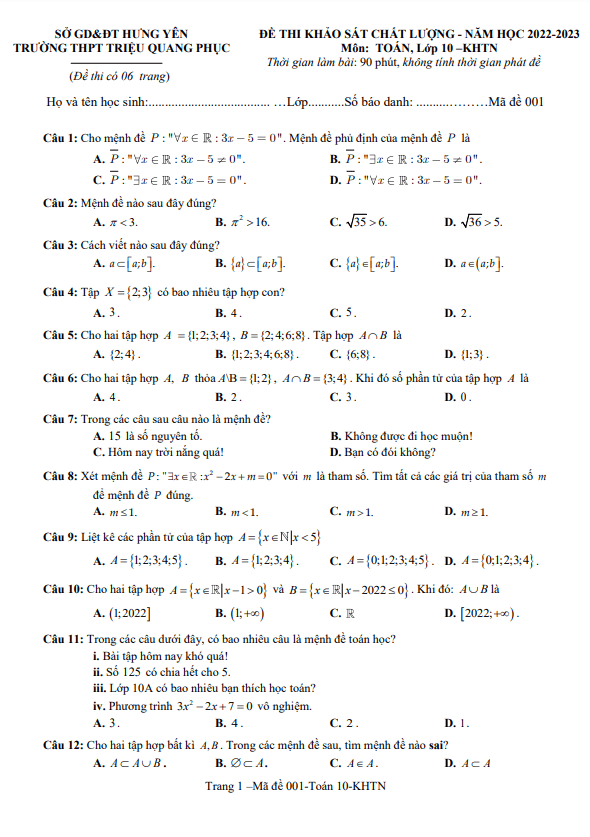 Khảo Sát Chất Lượng Toán 10 Đề khảo sát môn Toán 10 năm 2022 – 2023 trường THPT Triệu Quang Phục – Hưng Yên 27/10/2022