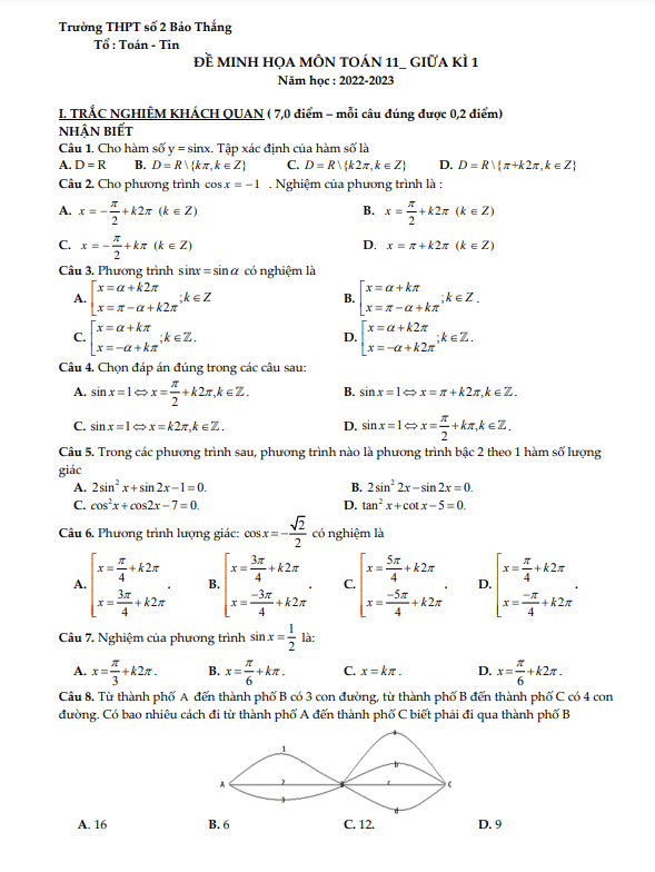 Đề Thi Giữa HK1 Toán 11 Đề minh họa Toán 11 giữa kì 1 năm 2022 – 2023 trường THPT Bảo Thắng 2 – Lào Cai 30/10/2022