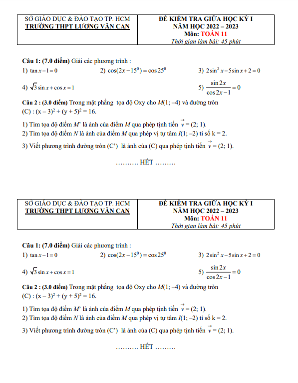 Đề Thi Giữa HK1 Toán 11 Đề thi giữa HKI Toán 11 năm 2022 – 2023 trường THPT Lương Văn Can – TP HCM 31/10/2022
