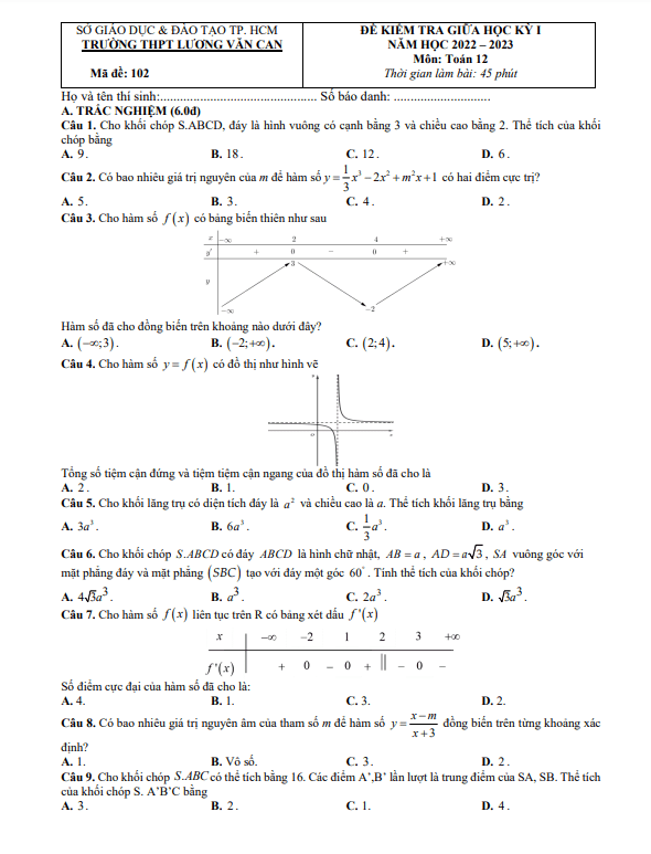 Đề Thi Giữa HK1 Toán 12 Đề thi giữa HKI Toán 12 năm 2022 – 2023 trường THPT Lương Văn Can – TP HCM 31/10/2022