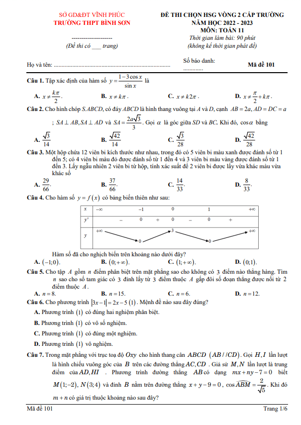 Đề Thi HSG Toán 11 Đề HSG cấp trường Toán 11 vòng 2 năm 2022 – 2023 trường THPT Bình Sơn – Vĩnh Phúc 09/03/2023