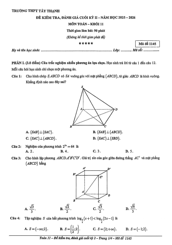 Trích dẫn Đề giữa học kỳ 2 Toán 12 năm 2022 – 2023 trường THPT Nguyễn Huệ – Quảng Nam: