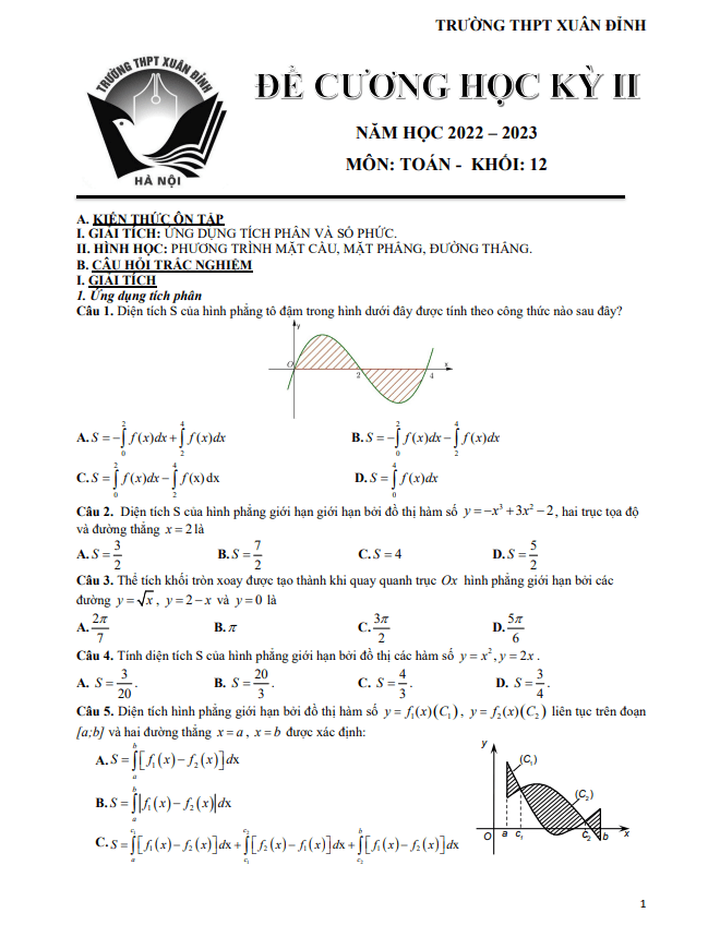 Đề Cương Ôn Tập Toán 12 Đề cương học kỳ 2 Toán 12 năm 2022 – 2023 trường THPT Xuân Đỉnh – Hà Nội 03/04/2023