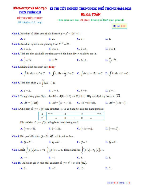 Đề Thi Thử THPT Môn Toán Đề thi thử tốt nghiệp THPT năm 2023 môn Toán sở GD&ĐT Thừa Thiên Huế 01/04/2023