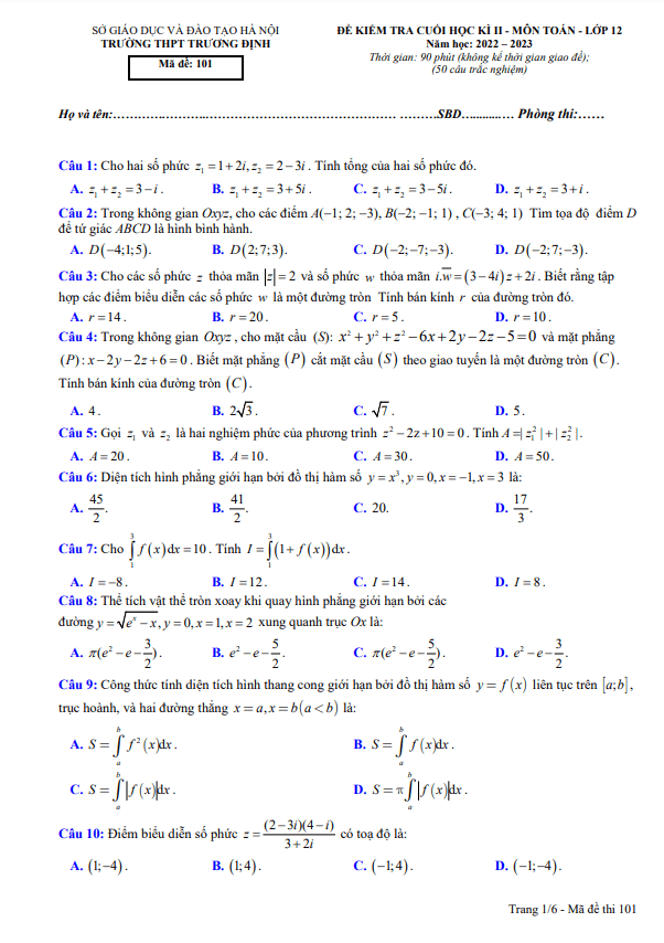 Đề Thi HK2 Toán 12 Đề cuối học kì 2 Toán 12 năm 2022 – 2023 trường THPT Trương Định – Hà Nội 30/05/2023
