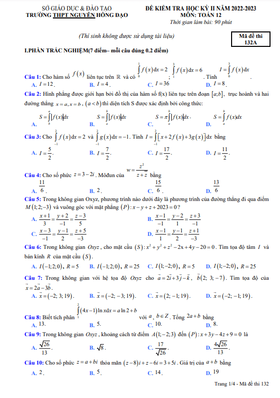 Đề Thi HK2 Toán 12 Đề học kỳ 2 Toán 12 năm 2022 – 2023 trường THPT Nguyễn Hồng Đạo – Bình Định 30/05/2023