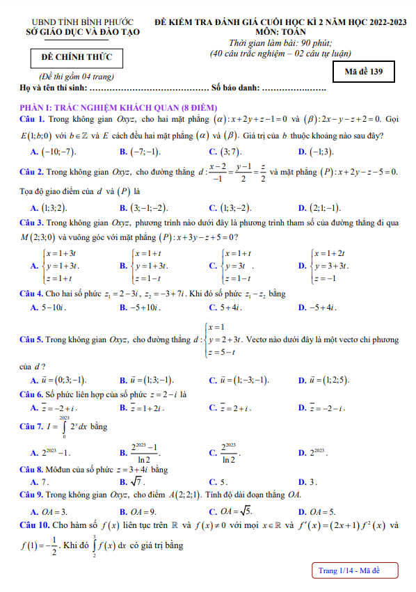 Đề Thi Thử THPT Môn Toán Đề thi thử tốt nghiệp THPT 2023 môn Toán lần 2 sở GD&ĐT Bình Phước 28/05/2023