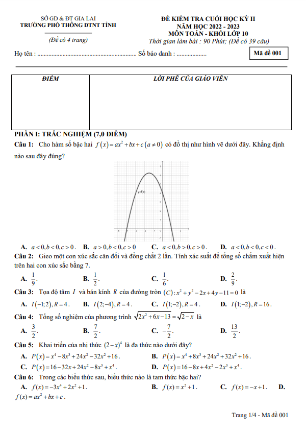 Đề Thi HK2 Toán 10 Đề cuối học kỳ 2 Toán 10 năm 2022 – 2023 trường Phổ thông DTNT tỉnh Gia Lai 26/05/2023
