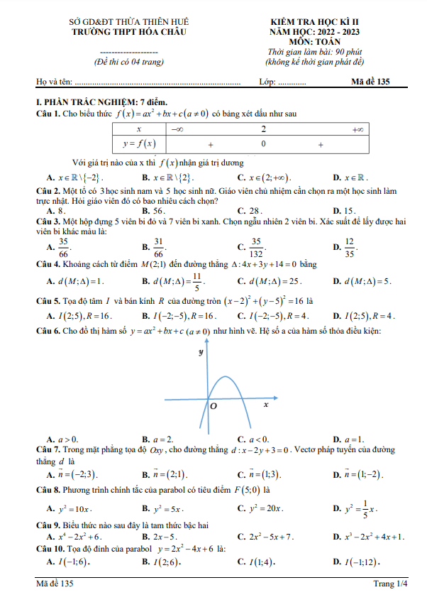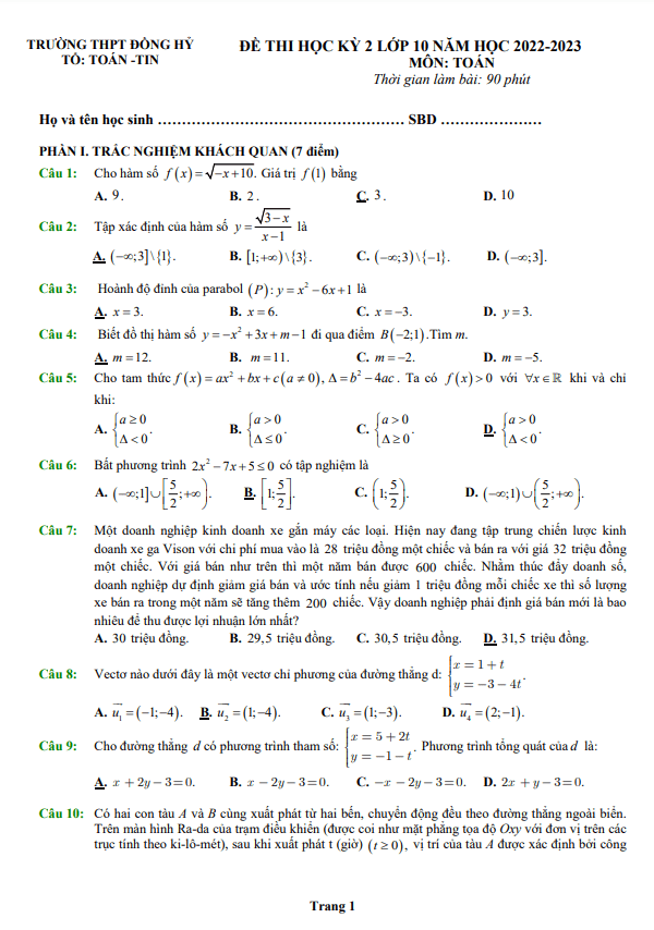 Đề Thi HK2 Toán 10 Đề thi học kỳ 2 Toán 10 năm 2022 – 2023 trường THPT Đồng Hỷ – Thái Nguyên 26/05/2023