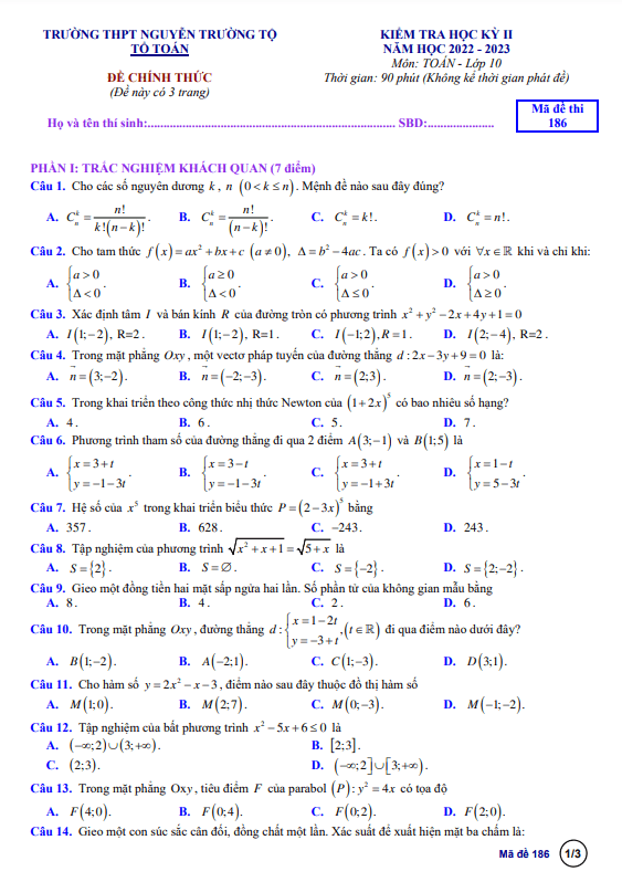 Đề Thi HK2 Toán 10 Đề học kỳ 2 Toán 10 năm 2022 – 2023 trường THPT Nguyễn Trường Tộ – TT Huế 11/05/2023