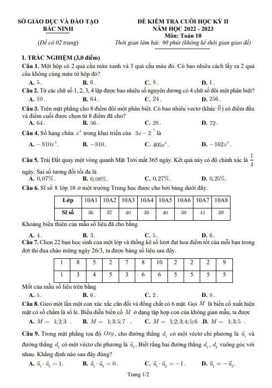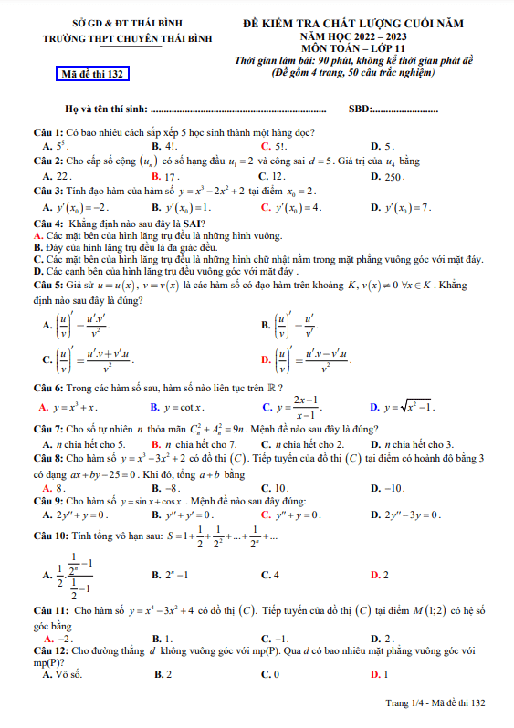 Khảo Sát Chất Lượng Toán 11 Đề kiểm tra chất lượng Toán 11 năm 2022 – 2023 trường THPT chuyên Thái Bình 10/05/2023