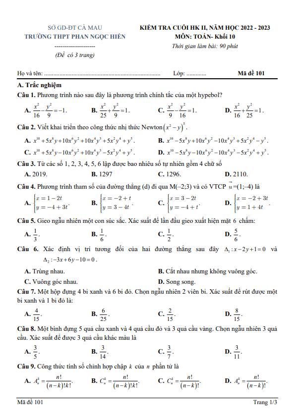 Đề Thi HK2 Toán 10 Đề cuối kỳ 2 Toán 10 năm 2022 – 2023 trường THPT Phan Ngọc Hiển – Cà Mau 13/05/2023