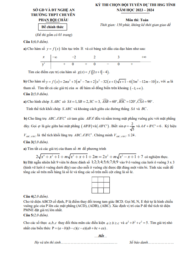 Đề Thi HSG Toán 12 Đề chọn ĐT thi HSG tỉnh môn Toán năm 2023 – 2024 chuyên Phan Bội Châu – Nghệ An 19/09/2023