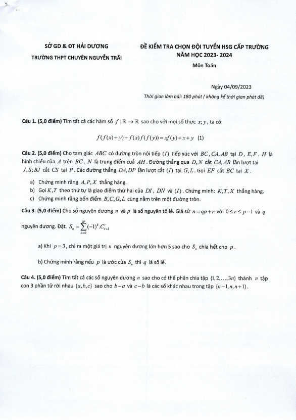 Đề Thi HSG Toán 12 Đề HSG Toán cấp trường năm 2023 – 2024 trường chuyên Nguyễn Trãi – Hải Dương 21/09/2023