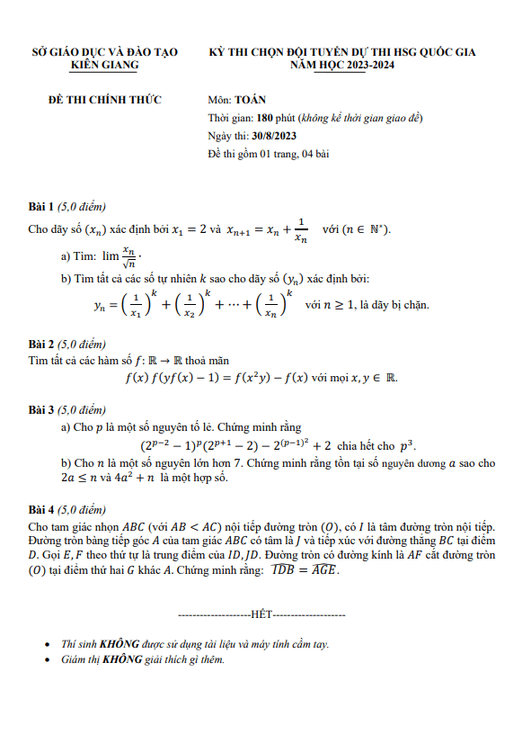 Đề chọn đội tuyển thi HSG QG môn Toán năm 2023 – 2024 sở GD&ĐT Kiên Giang