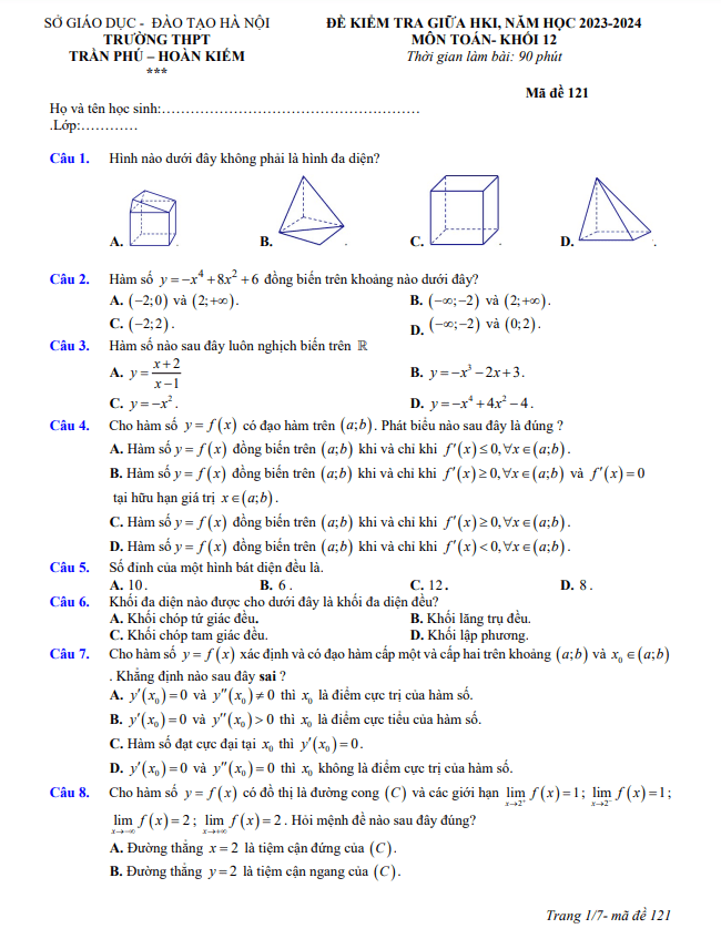 Đề giữa học kì 1 Toán 12 năm 2023 – 2024 trường THPT Trần Phú – Hà Nội