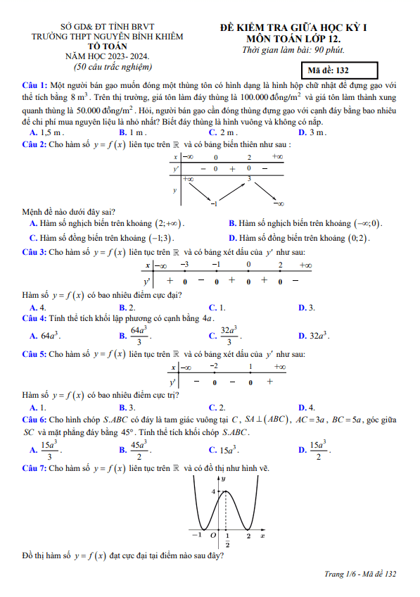Đề giữa học kỳ 1 Toán 12 năm 2023 – 2024 trường THPT Nguyễn Bỉnh Khiêm – BR VT