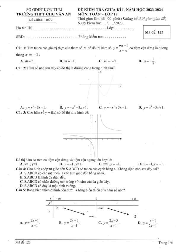 Đề giữa kì 1 Toán 12 năm 2023 – 2024 trường THPT Chu Văn An – Kon Tum