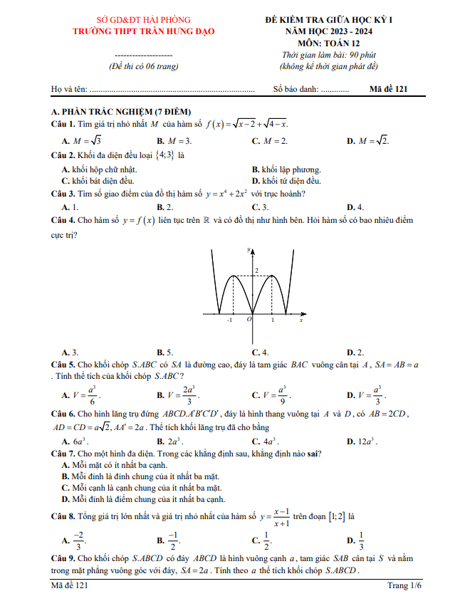 Đề giữa kỳ 1 Toán 12 năm 2023 – 2024 trường THPT Trần Hưng Đạo – Hải Phòng
