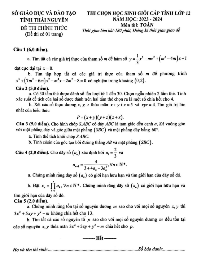 Đề học sinh giỏi cấp tỉnh Toán 12 năm 2023 – 2024 sở GD&ĐT Thái Nguyên