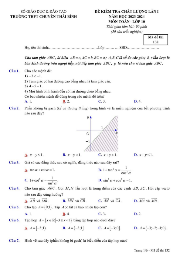 Đề kiểm tra chất lượng lần 1 Toán 10 năm 2023 – 2024 trường THPT chuyên Thái Bình