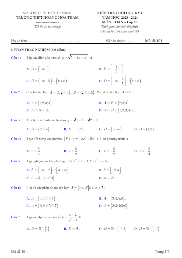 Đề Thi HK1 Toán 10 Đề cuối học kỳ 1 Toán 10 năm 2023 – 2024 trường THPT Hoàng Hoa Thám – TP HCM 01/01/2024