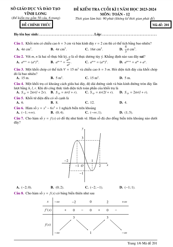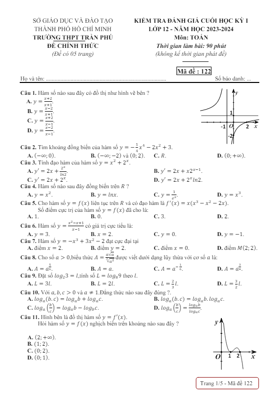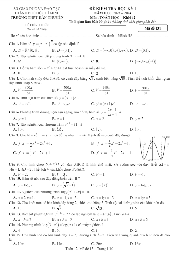 Đề Thi HK1 Toán 12 Đề cuối học kỳ 1 Toán 12 năm 2023 – 2024 trường chuyên Lê Hồng Phong – TP HCM 01/01/2024