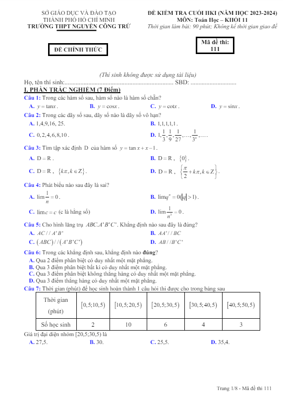 Đề Thi HK1 Toán 11 Đề cuối HK1 Toán 11 năm 2023 – 2024 trường THPT Nguyễn Công Trứ – TP HCM 10/01/2024