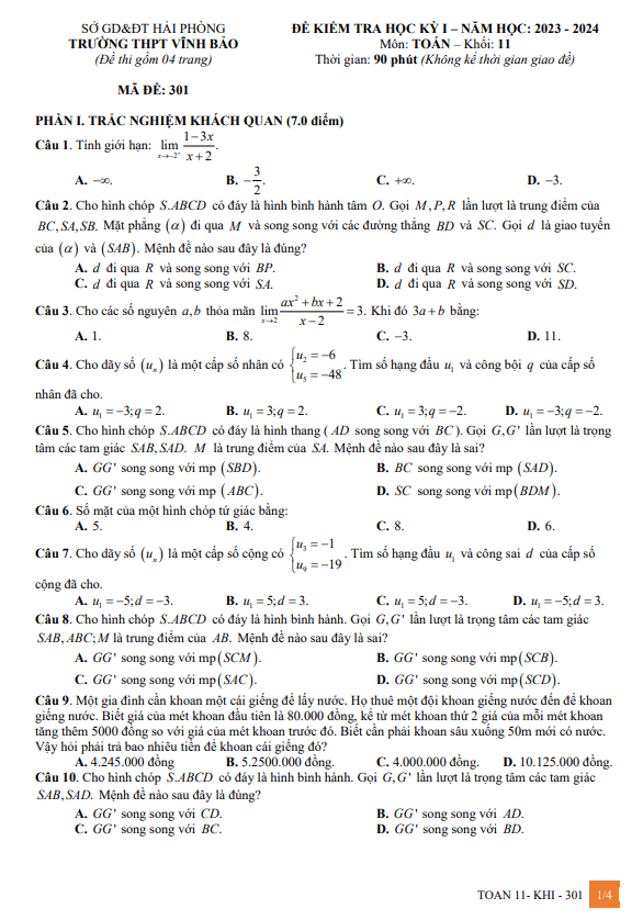 Đề Thi HSG Toán 11 Đề học sinh giỏi Toán 11 năm 2023 – 2024 trường THPT Ngô Gia Tự – Phú Yên 03/01/2024