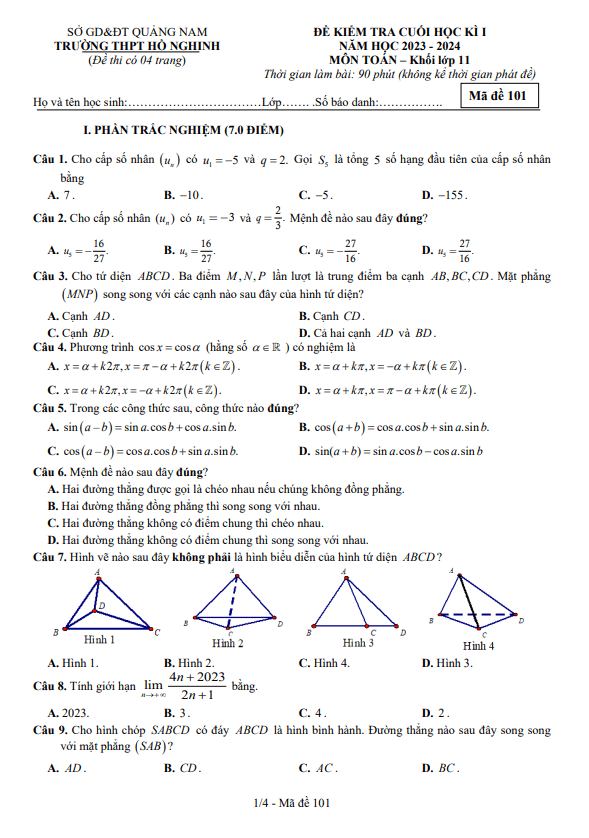 Đề Thi HK1 Toán 10 Đề học kỳ 1 Toán 10 năm 2023 – 2024 trường THPT Trần Kỳ Phong – Quảng Ngãi 04/01/2024